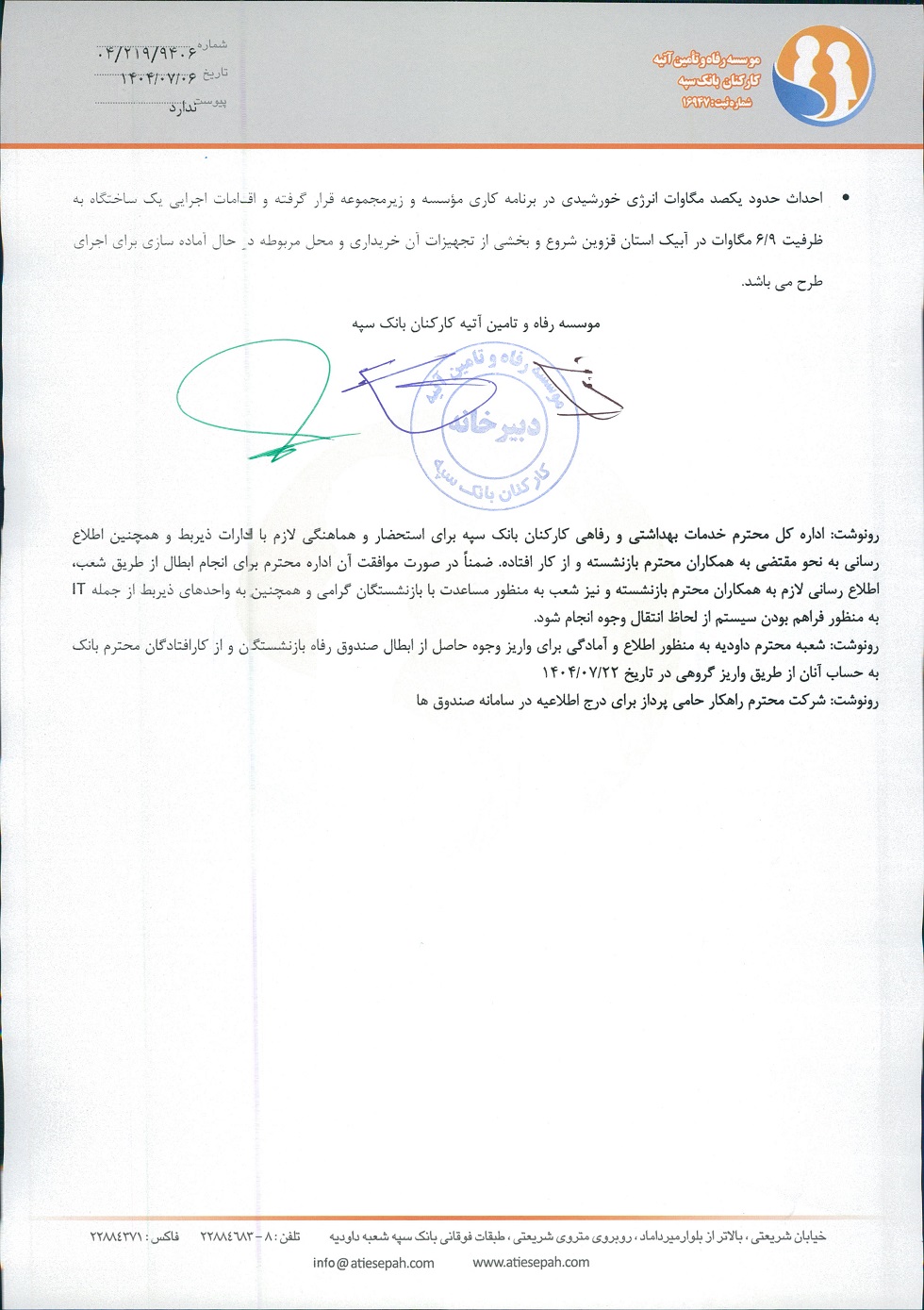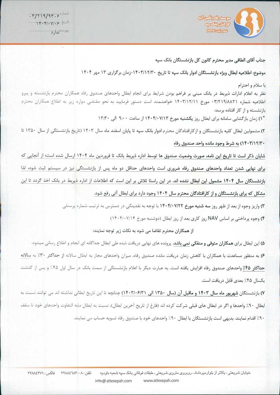 اطلاعیه واریز وجه ابطال بهمن ماه 1403 ویژه بازنشستگان ادوار بانک سپه