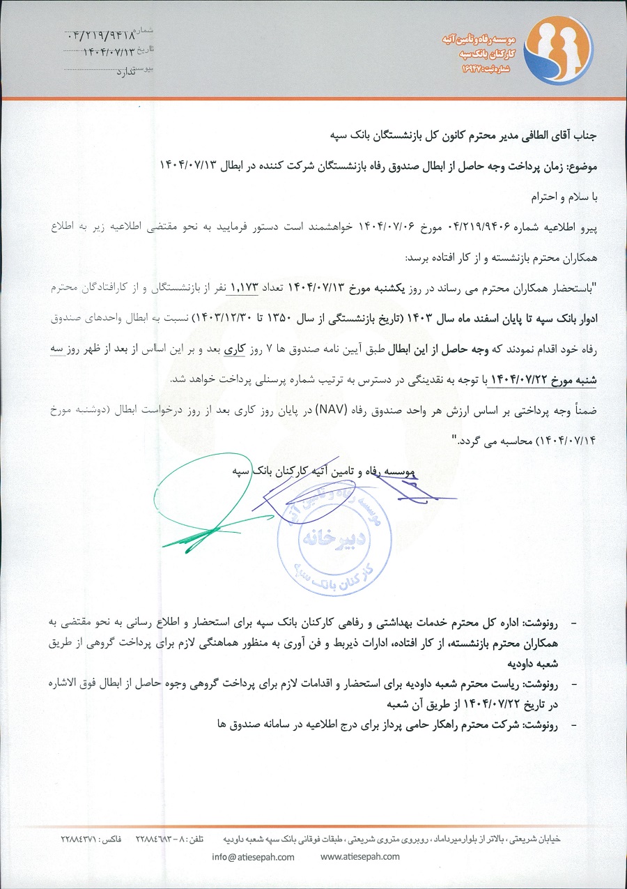 اطاعیه زمان پرداخت وجه حاصل از ابطال صندوق رفاه بازنشستگان شرکت کننده در ابطال 1404/07/13