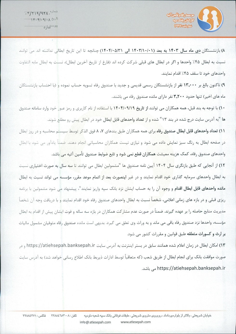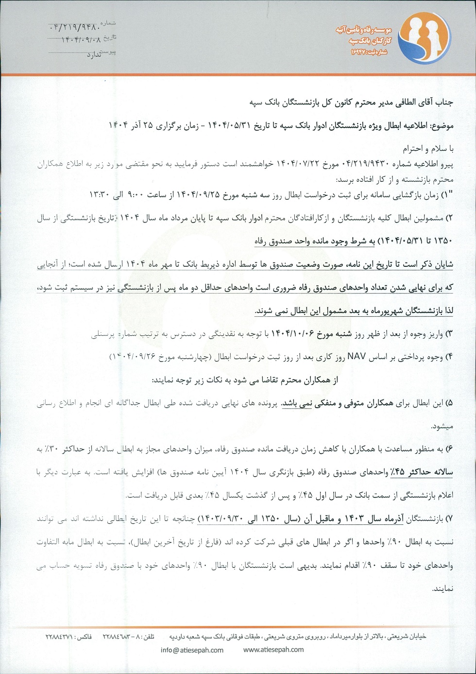 اطلاعیه ابطال ویژه بازنشستگان ادوار بانک سپه تا تاریخ 1404/05/31 - زمان برگزاری 25 آذر 1404
