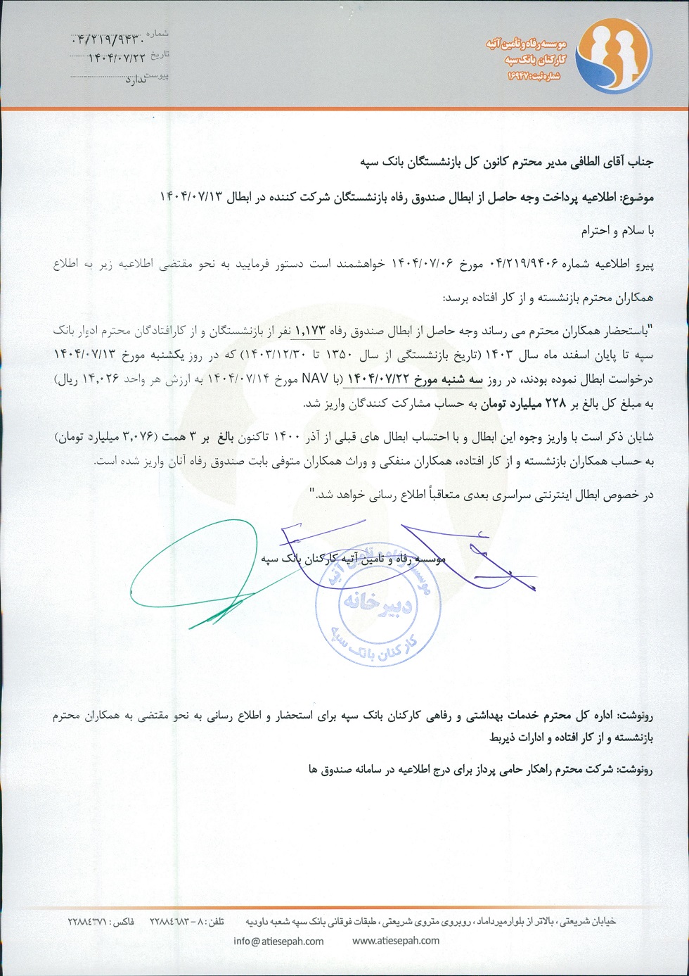 اطاعیه زمان پرداخت وجه حاصل از ابطال صندوق رفاه بازنشستگان شرکت کننده در ابطال 1404/07/13